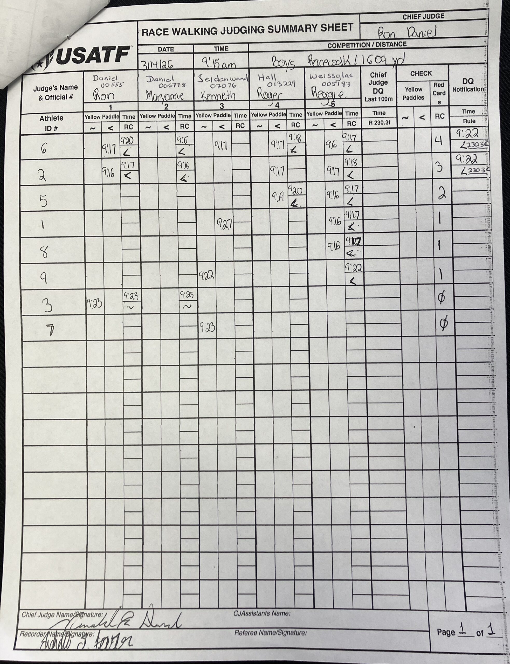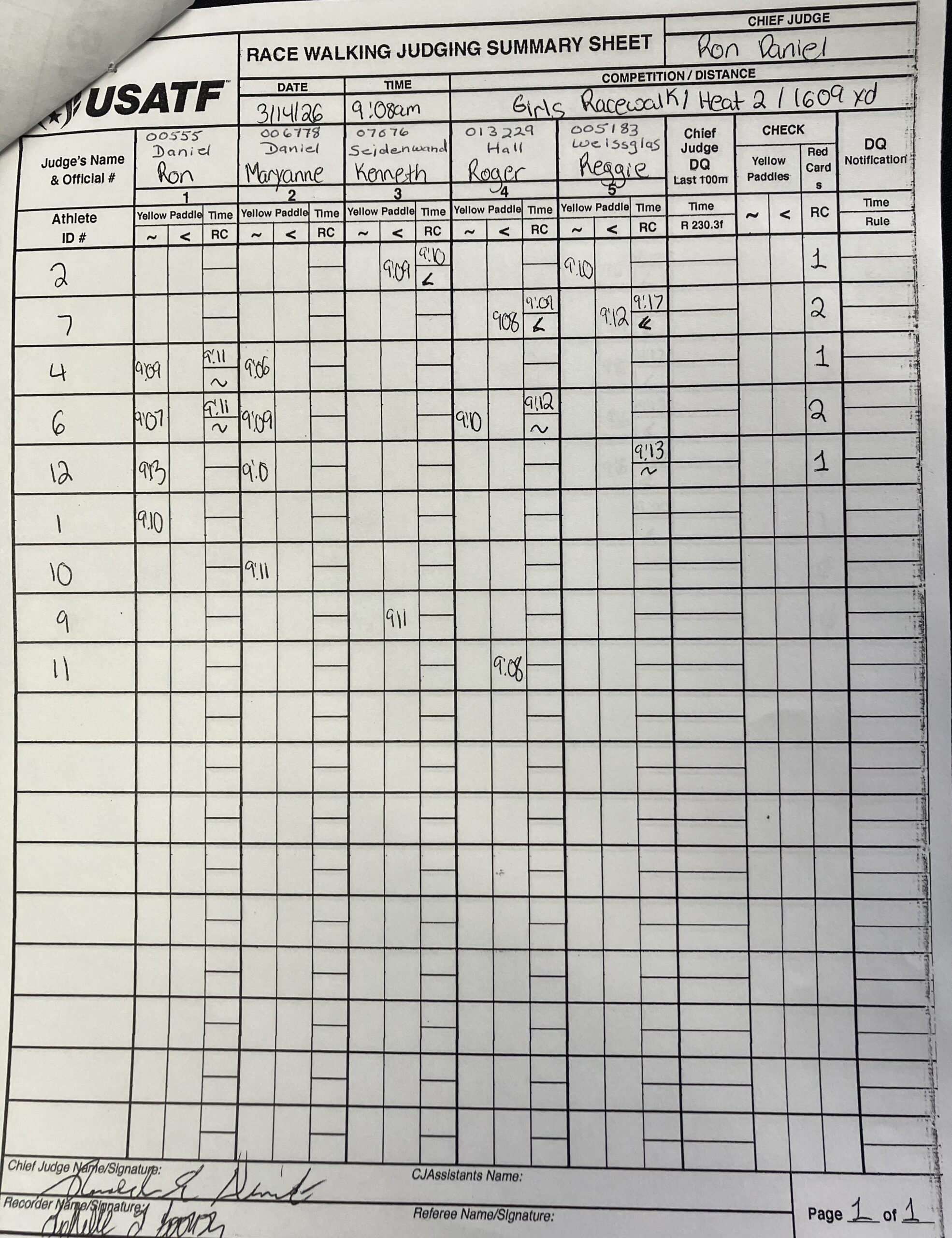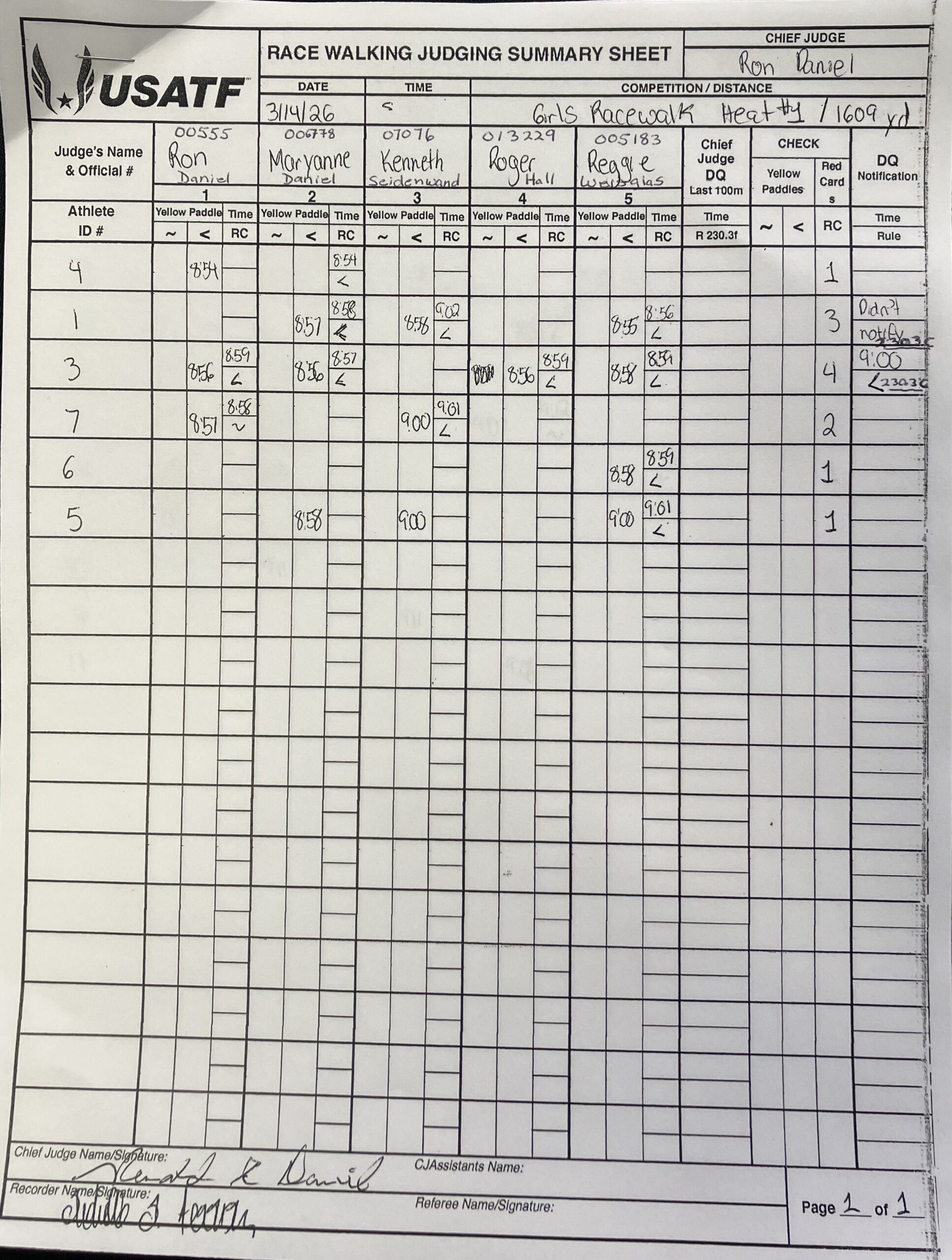 The file can be a high quality image or a pdf file. The full names and USATF Official Certification # of all officials must be included.