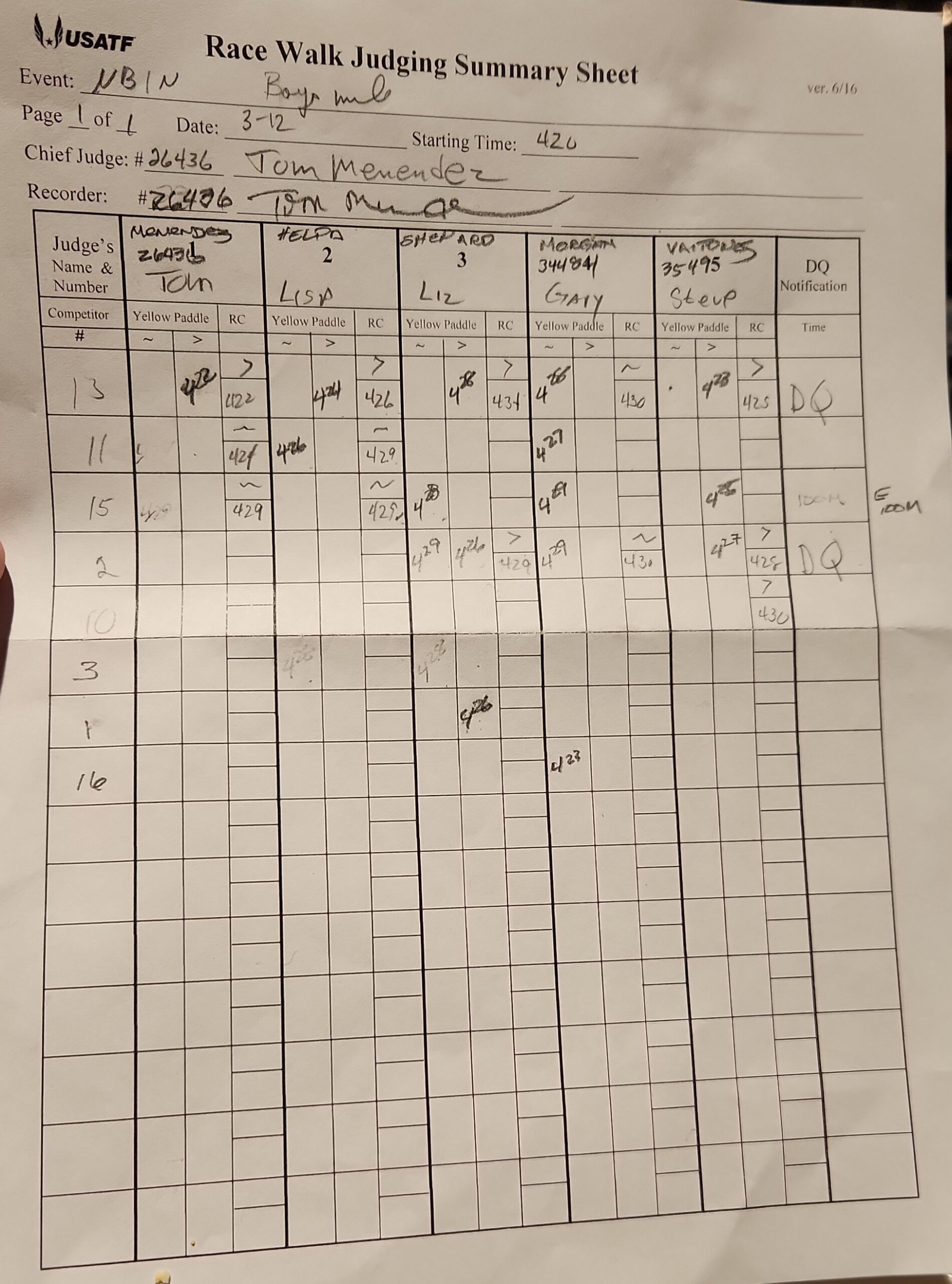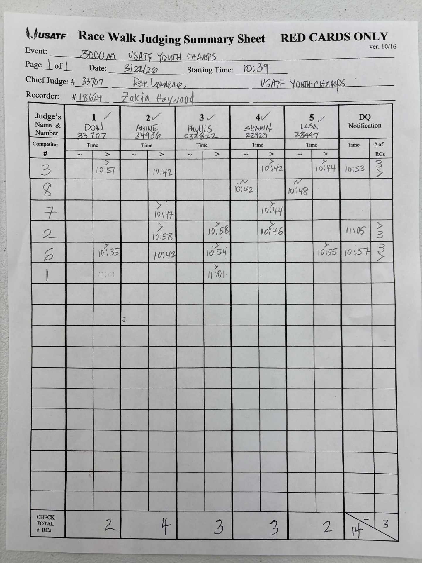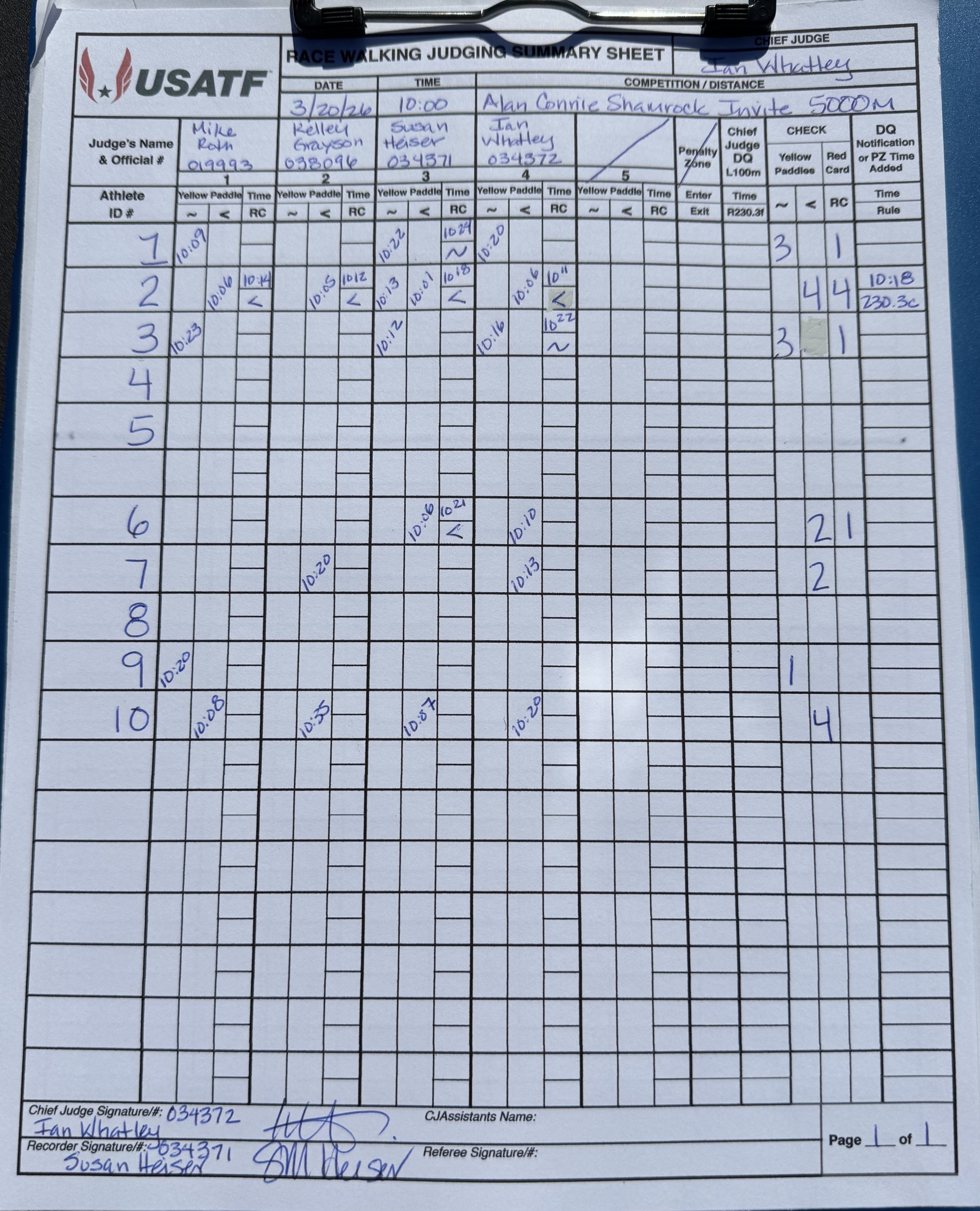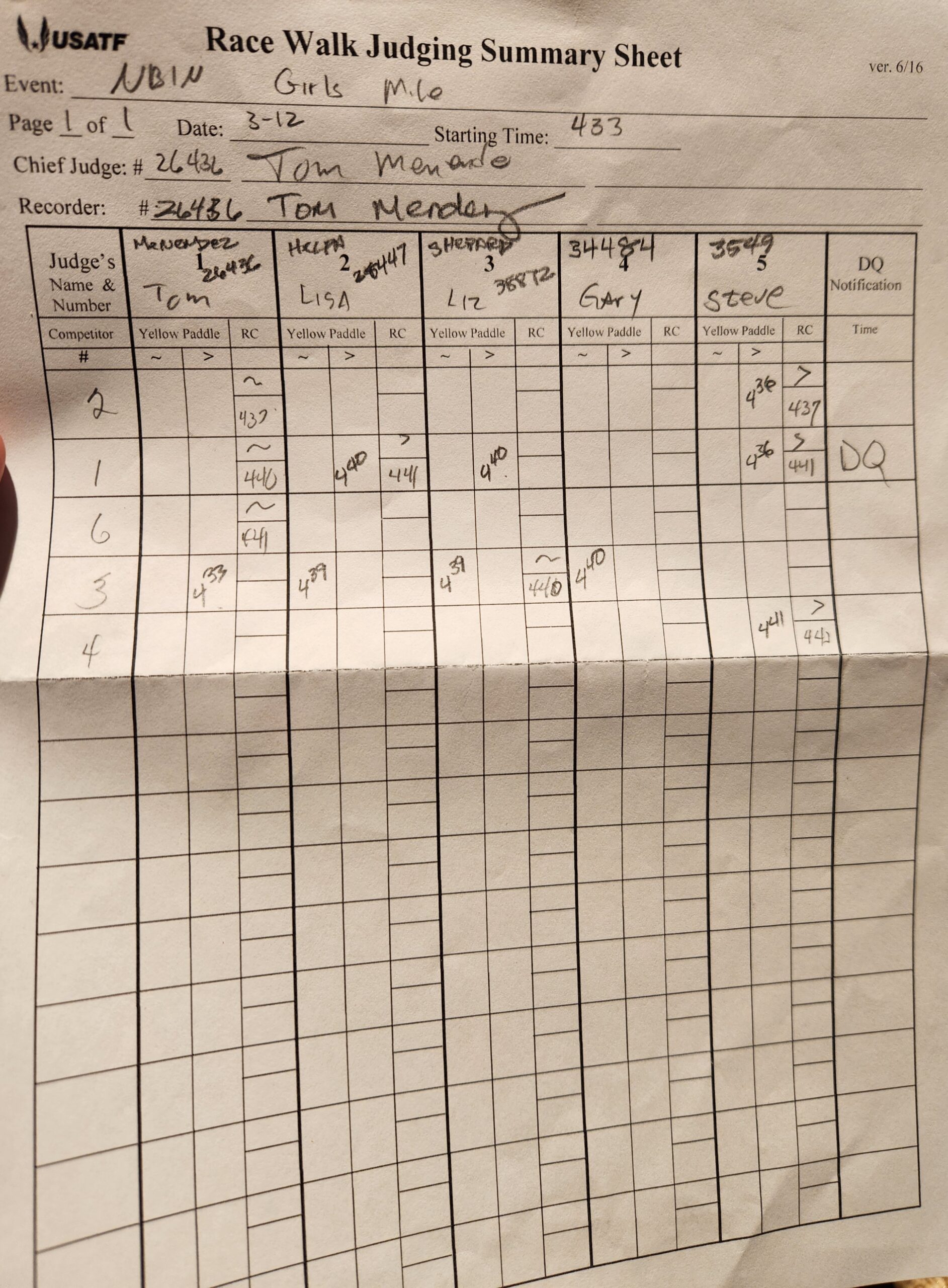 The file can be a high quality image or a pdf file. The full names and USATF Official Certification # of all officials must be included.