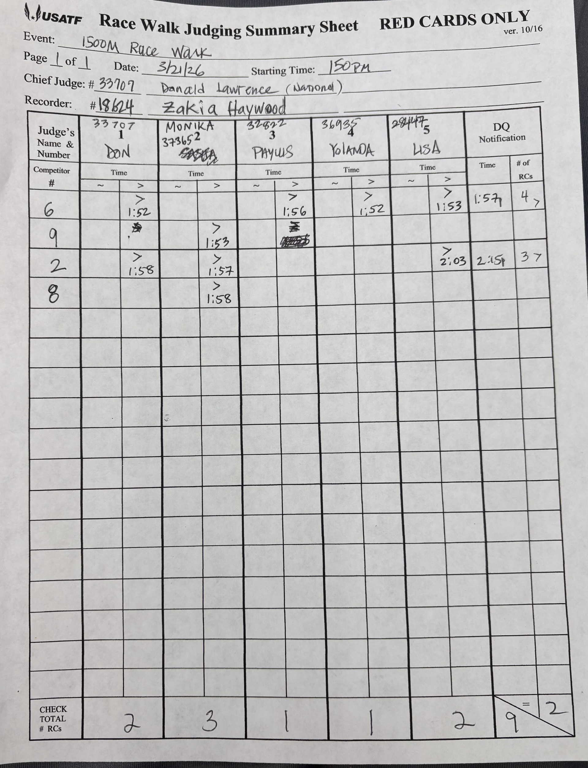 In an effort to provide Judging transparency, the RW Committee will post Championship event Summary Sheets to verify the officiating of major events. At the conclusion of all events, copies of these sheets must be emailed to racewalkvicechair@usatf.org by clicking that link.